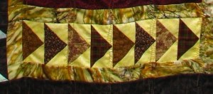 The bottom strip of flying geese are left over from pillow covers. The cheery yellow fabric that sets off the browns has a silvery cast to it and tiny threads of red when you get close up so it really strikes the eye.