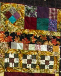 Each of these elements is connected to the other using the same fabric, a light mustard batik spattered by dark brown with some late summer green thrown in for good measure. The choice of connective tissue is key in a quilt like this because the eye needs a map to follow.