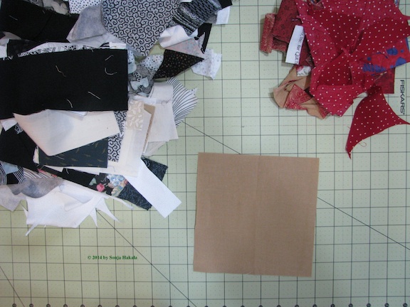 Like most quilters, I don’t throw away very much fabric. Odd triangles and very thin strips are the usual contributions to my wastebasket. Everything else gets sorted by color family and stored in large plastic bags.