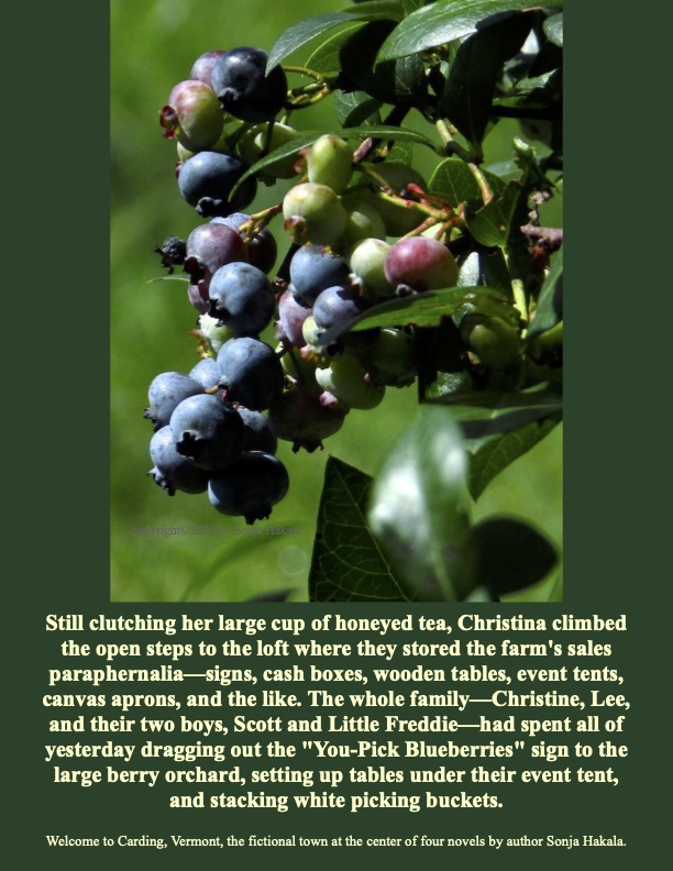 Still clutching her large cup of honeyed tea, she climbed the open steps to the loft where they stored the farm’s sales paraphernalia—signs, cash boxes, wooden tables, event tents, canvas aprons, and the like. The whole family—Christina, Lee, and their two boys, Scott and Little Freddie—had spent all of yesterday dragging out the “You-Pick Blueberries” sign to the large berry orchard, setting up tables under their event tent, and stacking white picking buckets.