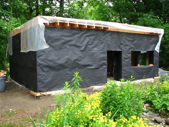 We cover the sides of our new building with tar paper and the top with plastic before it starts raining